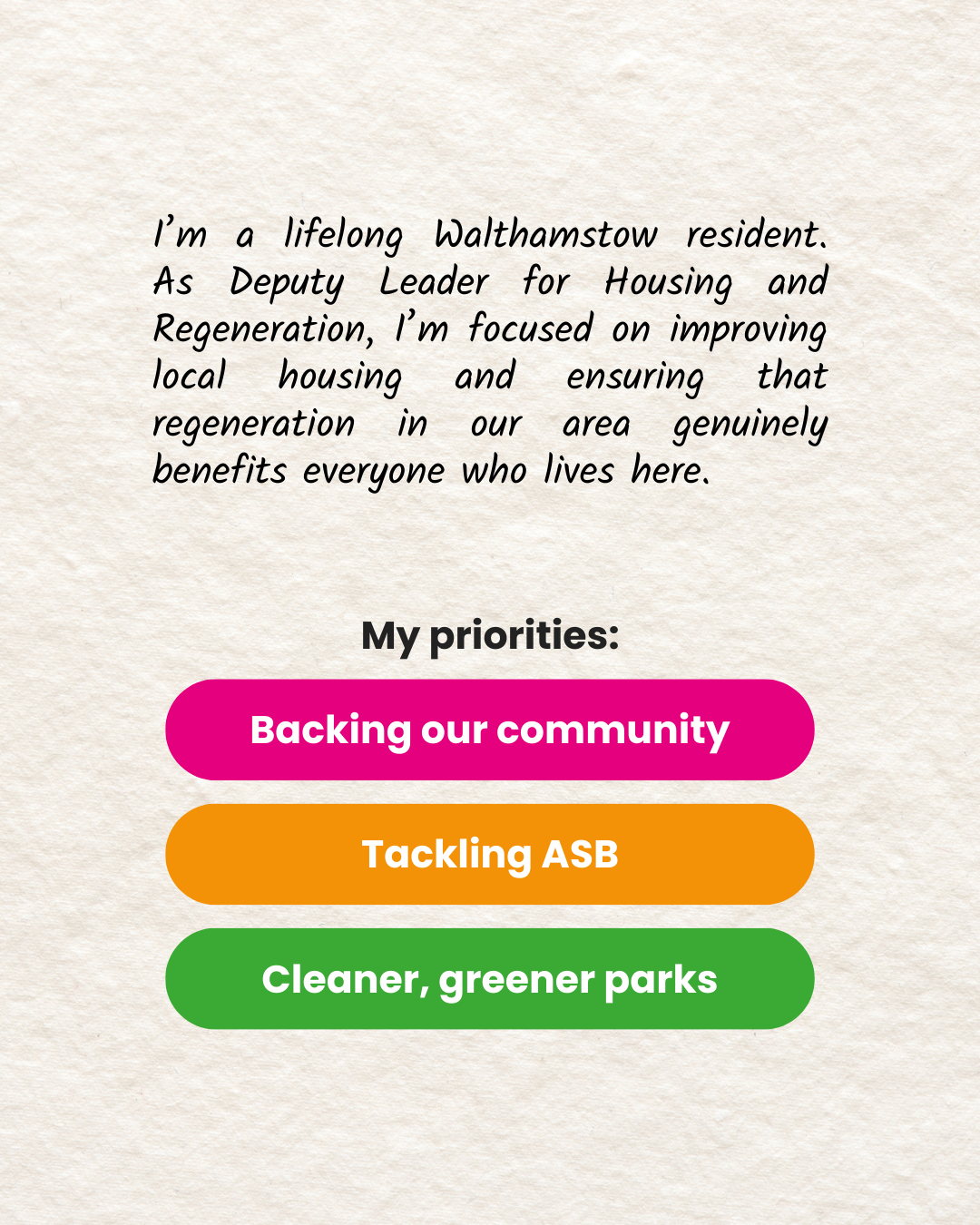 Ahsan Khan Labour Councillor and candidate for Hoe Street Deputy Leader with responsibility for Housing and Regeneration