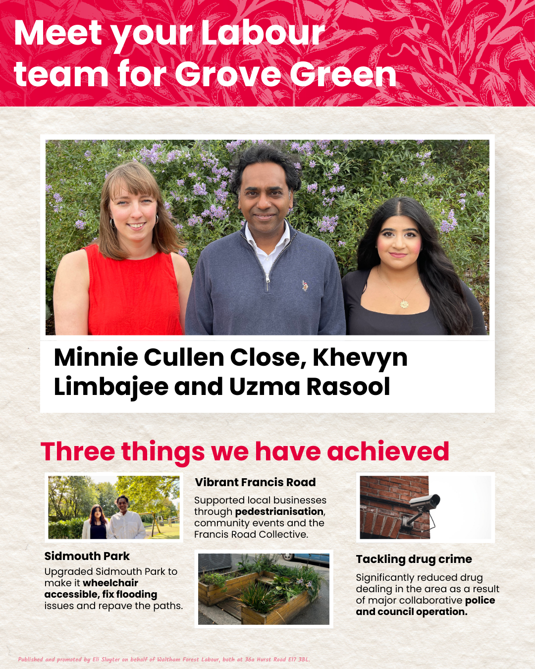 Grove Green Labour Find out more about your candidates Minnie Cullen Close Khevyn Limbajee Uzma Rasool Get in touch Email